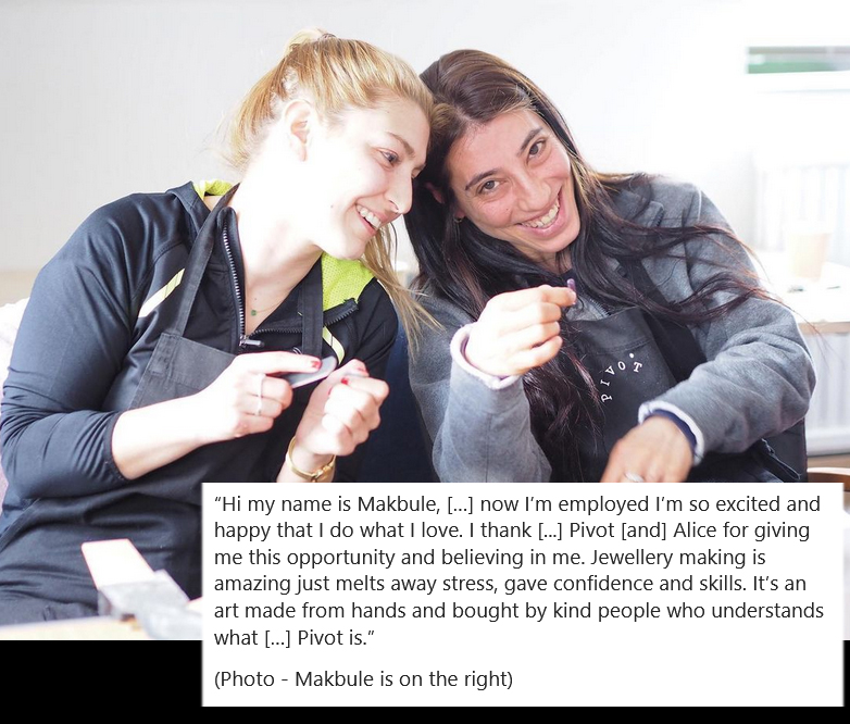 “Hi my name is Makbule, […] now I’m employed I’m so excited and happy that I do what I love. I thank […] Pivot [and] Alice for giving me this opportunity and believing in me. Jewellery making is amazing just melts away stress, gave confidence and skills. It’s an art made from hands and bought by kind people who understands what […] Pivot is.”