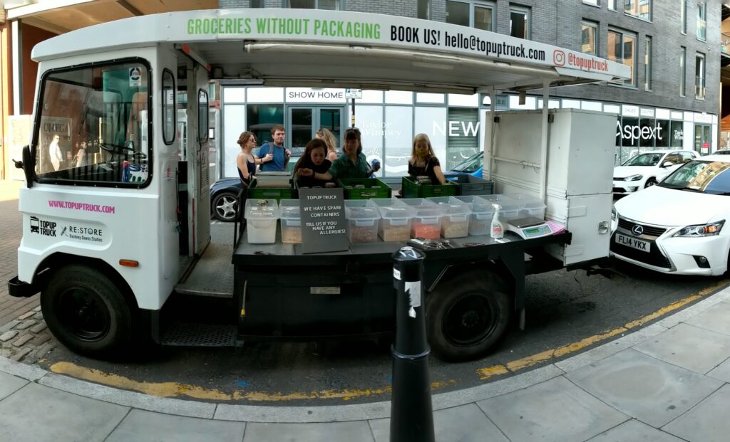 Customers book a slot, tell their neighbours when and where the TOPUP TRUCK is coming to… and when the truck arrives, they file out onto the street and shop using their own containers.